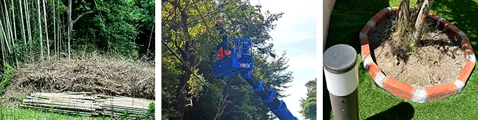 伐採後の処分まで対応し、現場を綺麗に片付けます。庭の樹木の処理、土地売却のための樹木撤去など、さまざまなご相談に対応しています。
