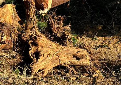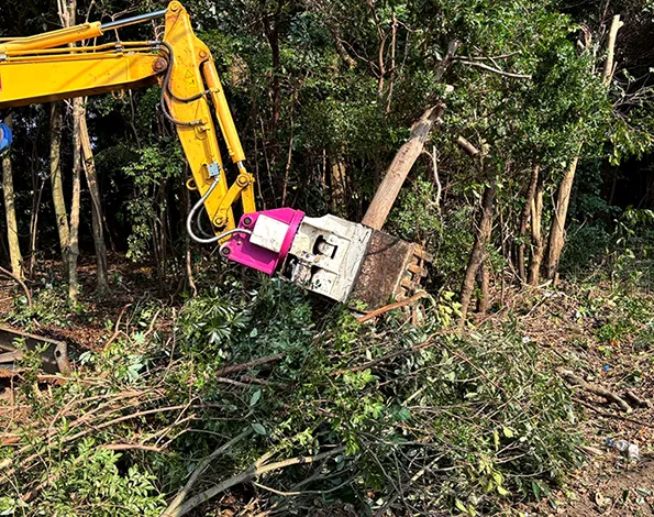 チェーンソーや重機で樹木を切り倒し、適当な長さに切り分けます。根が残っていると次の工事に影響するため、必要に応じて掘り起こします。庭木から山林まで対応します。
