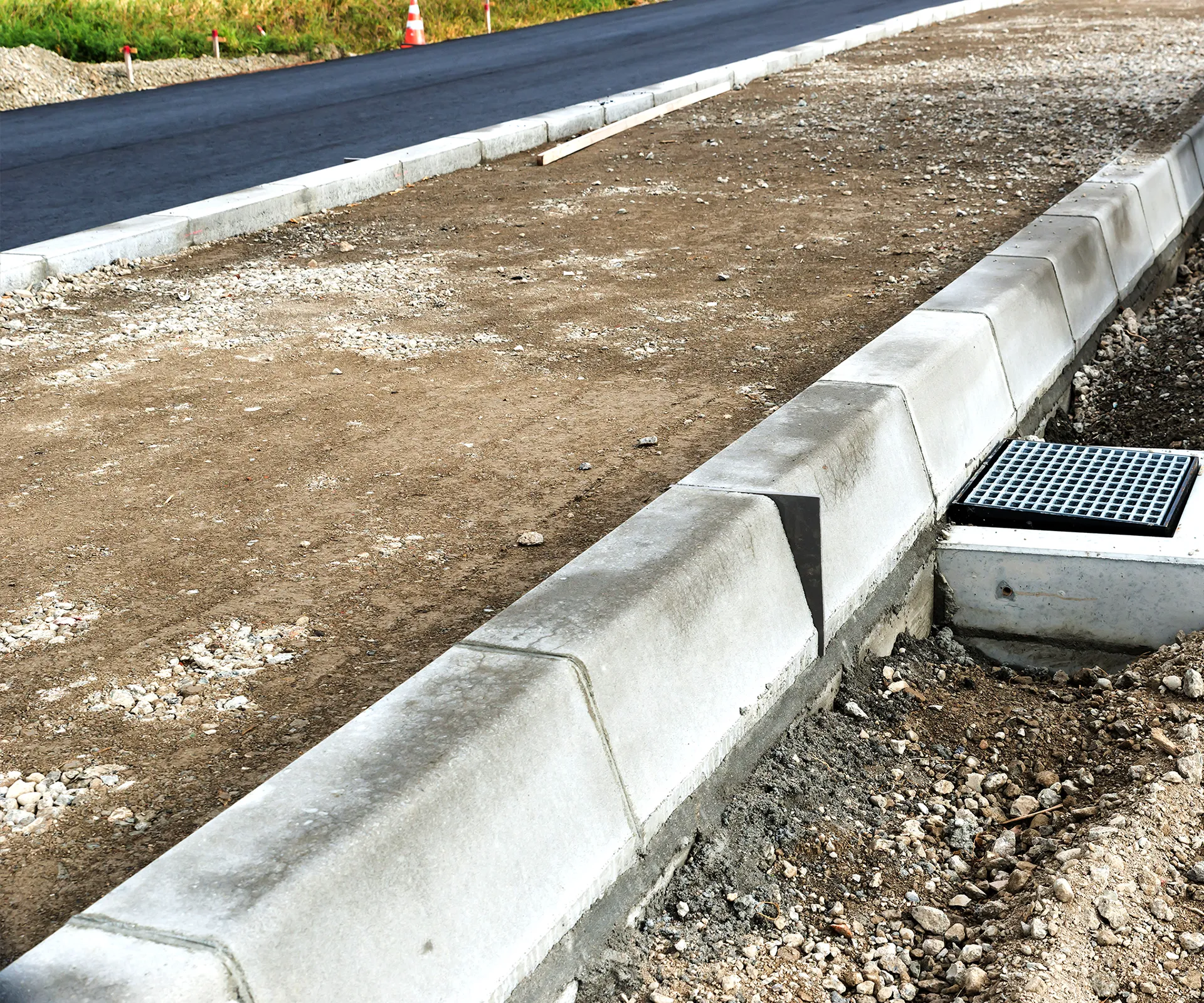 雨水が溜まらないよう傾斜をつけ、側溝や集水桝を設けて排水経路を確保します。