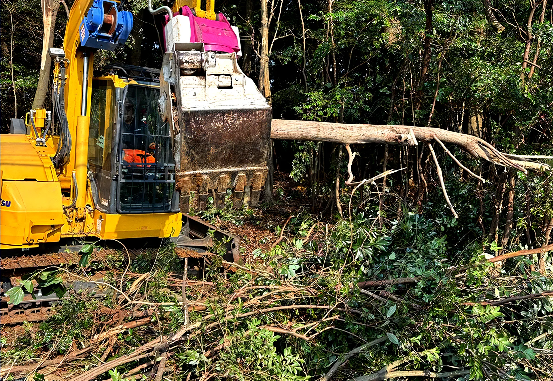 伐採・伐根・特殊伐採に対応しており、造成工事や外構工事にあわせたご依頼はもちろん、伐採のみのご相談も承っています。庭木から山林まで、樹木に関する作業を幅広く行っています。